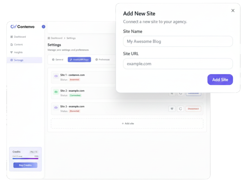 Contenvo works alongside your existing website or CMS. It connects to your site and adds powerful tools for content creation, planning, insights and multi-site management.